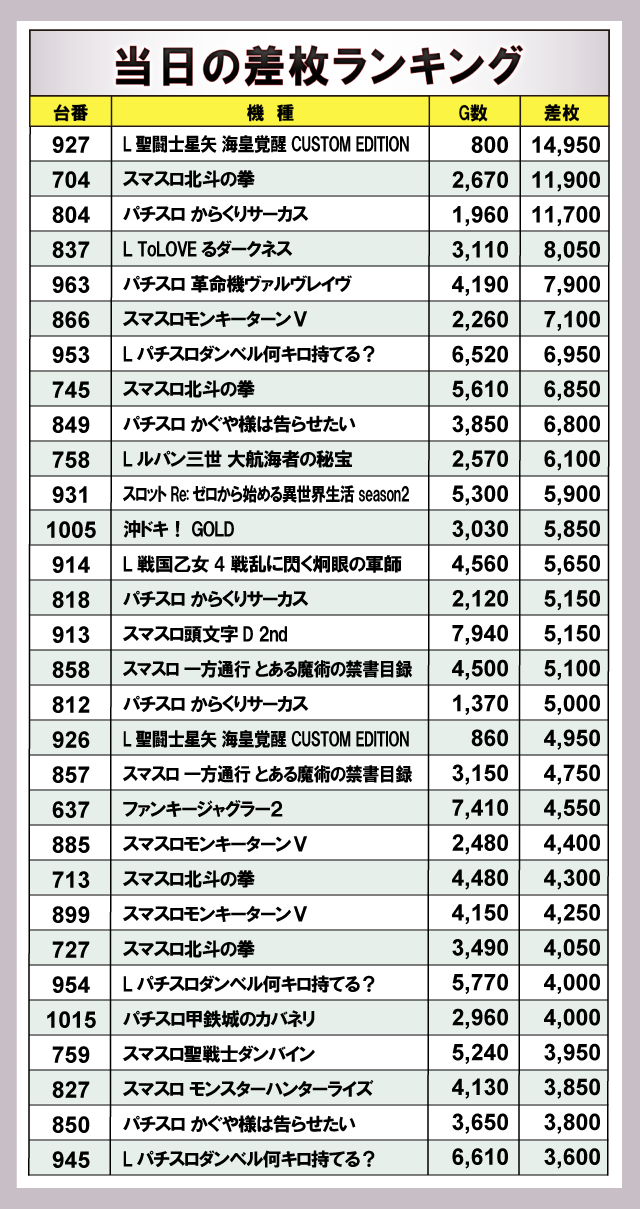 優秀台に目を通してみると、差枚数で大きな数字を打ち立てたのが『L聖闘士星矢 海皇覚醒 CUSTOM EDITION』『スマスロ北斗の拳』『パチスロ からくりサーカス』の3機種で万枚OVERを記録!さらに、『L ToLOVEるダークネス』で+8,000枚OVER、『パチスロ 革命機ヴァルヴレイヴ』『スマスロモンキーターンⅤ』で+7,000枚OVERを記録するなど、店内は熱気に包まれていた。そのほか、スマスロ人気機種や新台が中心となって盛り上がりを形成しており、各所でファンが笑顔を浮かべる光景が広がっていた。