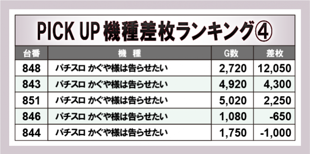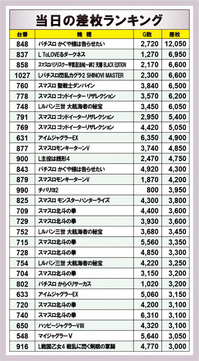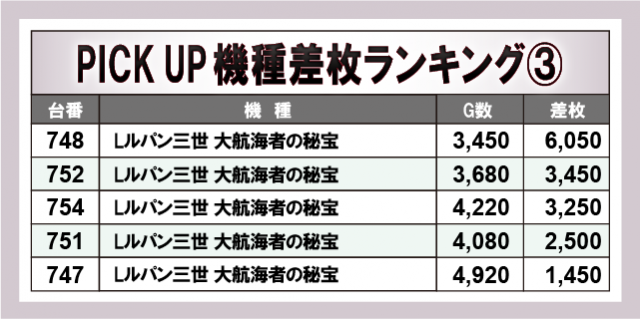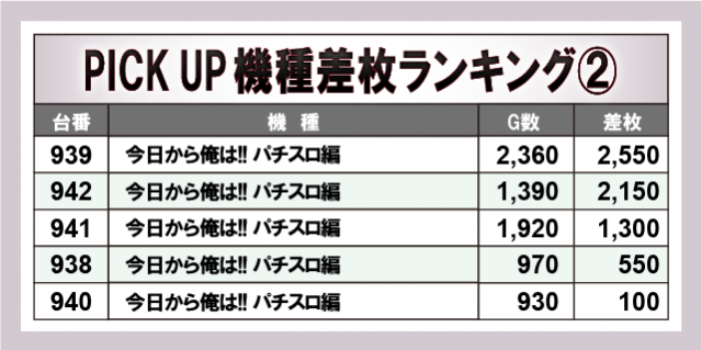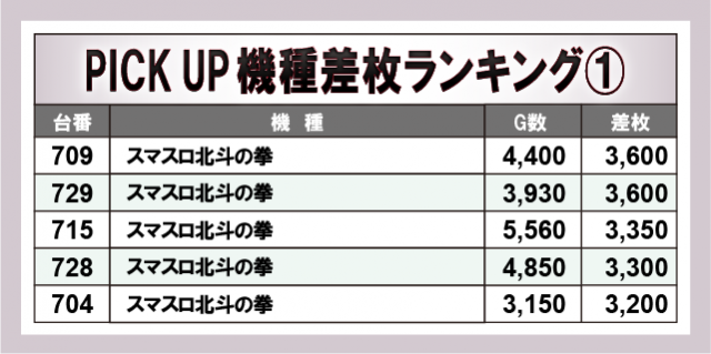上表の5機種から4桁プラス台が多数発生し、ファンが自信をもってレバーを叩いていた様子が目に浮かぶ。いずれも同店が丁寧に扱っていると窺うことができ、今後も要注目のエリアなのは間違いないだろう。