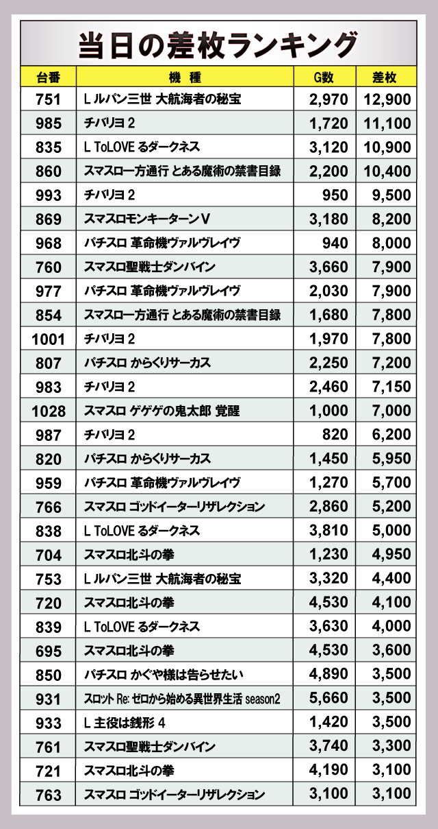 『Lルパン三世 大航海者の秘宝』や『チバリヨ2』、『L ToLOVEるダークネス』『スマスロ 一方通行 とある魔術の禁書目録』の4機種から万枚OVERが発生し、店内の熱気を引き上げていた。他にもまとまった出玉を確保する台を確認でき、遊技していたファンはコンスタントなボーナス当選に恍惚の表情を浮かべていたことだろう。