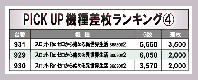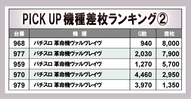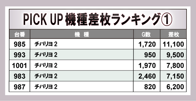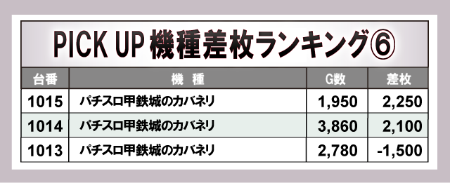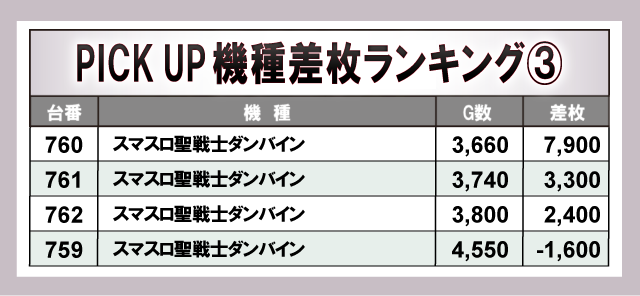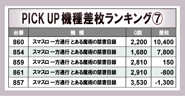 上表の8機種から大台突破台を筆頭に4桁プラス台が多数発生し、大きく盛り上がっていた様子でファンが自信をもってレバーを叩いていた様子が目に浮かぶ。いずれも同店が丁寧に扱っていると窺うことができ、今後も要注目のエリアなのは間違いないだろう。