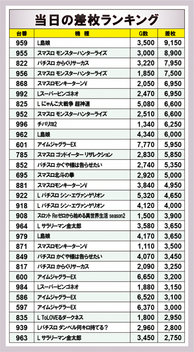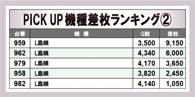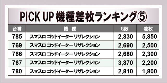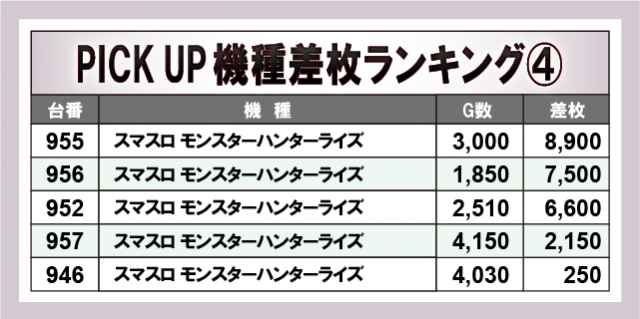 上表の優秀機種からは、いずれも大きな熱気が放たれていたようだ。『アイムジャグラーEX』から5,000枚OVERという大台突破台が生まれており、高いパフォーマンスにファンは恍惚の表情を浮かべていたことだろう。『L島娘』『スマスロモンキーターンV』『スマスロ モンスターハンターライズ』『スマスロ ゴッドイーター リザレクション』も同様に高い熱量を披露しており、あらゆる機種に可能性が眠っていたようだ。