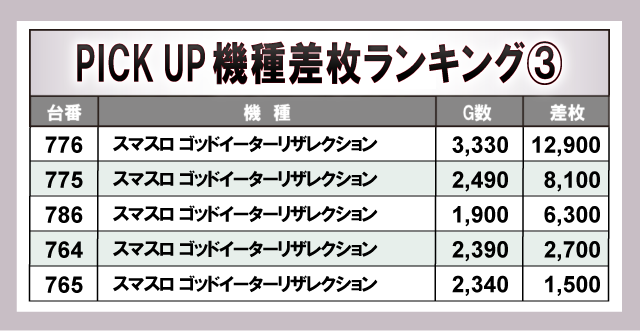 『スマスロ ゴッドイーターリザレクション』『Lスーパービンゴネオ』『チバリヨ2』の3台から万枚OVERが発生し、ハイパフォーマンスを披露!スマスロ人気機種だけではなく新台も多数ランクインしていたことから、各所でファンが笑顔を浮かべる光景が広がっていた。