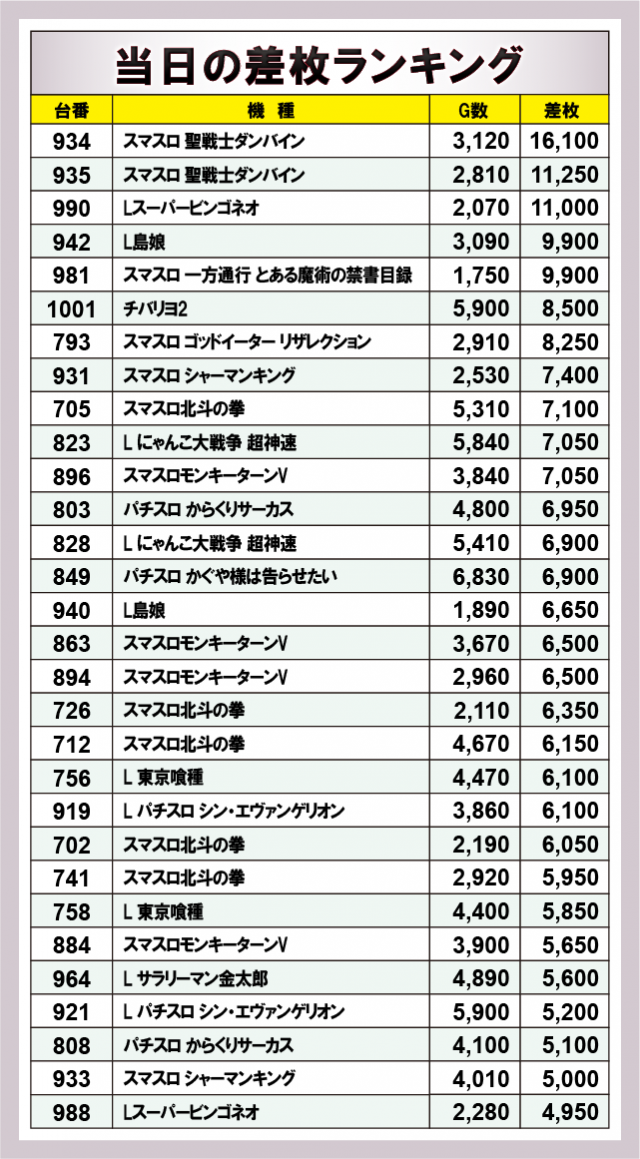 ※差枚数順に掲載しています。