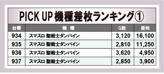 『スマスロ 聖戦士ダンバイン』から2台、『Lスーパービンゴネオ』から1台の万枚OVERが発生!さらに『L島娘』『スマスロ 一方通行 とある魔術の禁書目録』で+9,900枚の万枚未遂台が追随するなど、店内の盛り上がりに大きく貢献していた。また、ランキングはほぼ5,000枚以上からとなっており、各所で打ちごたえのある状況が整っていたことが窺える。ファンはしっかりと自信を持っていたのが顕著で、同店の入念な準備も報われたと言えるだろう。