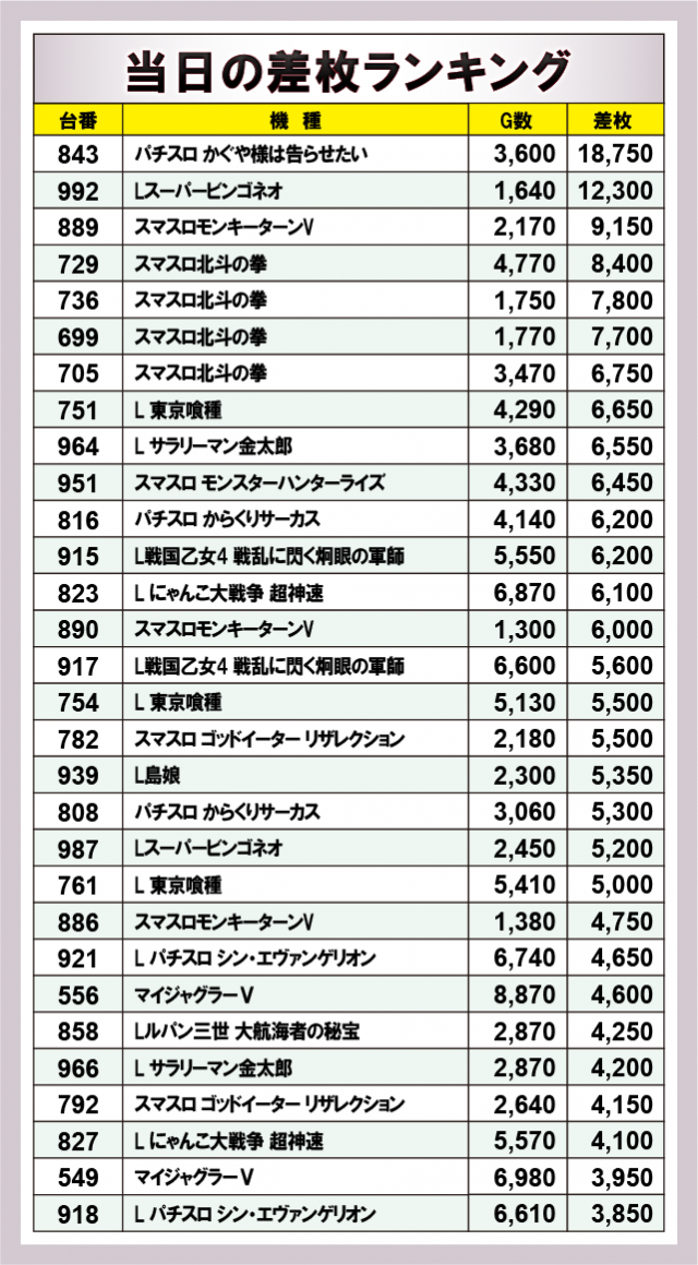 上表をご覧の通り、当日は『パチスロ かぐや様は告らせたい』『Lスーパービンゴネオ』から2台の万枚OVERが生まれている。さらにランキング30台は3千枚OVERからとなっており、店内は凄まじい熱気に包まれていた。定番人気機種はもちろん、『L 東京喰種』『L にゃんこ大戦争 超神速』『L島娘』といった新台も名を連ねており、各所で圧倒的な熱量を披露し力強くレバーを叩けていたことだろう。
