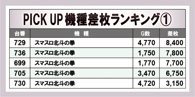 当日、特に盛り上がっていたのが上表の5機種。なかでも『スマスロ北斗の拳』『スマスロモンキーターンV』『マイジャグラーⅤ』ではプラス4桁OVERが多数うまれ、その盛り上がりぶりは他の島や機種にも伝播していったようだ。上表以外にもあらゆる機種が活躍し、ファンは相当な手応えを感じていた様子が窺えたぞ。