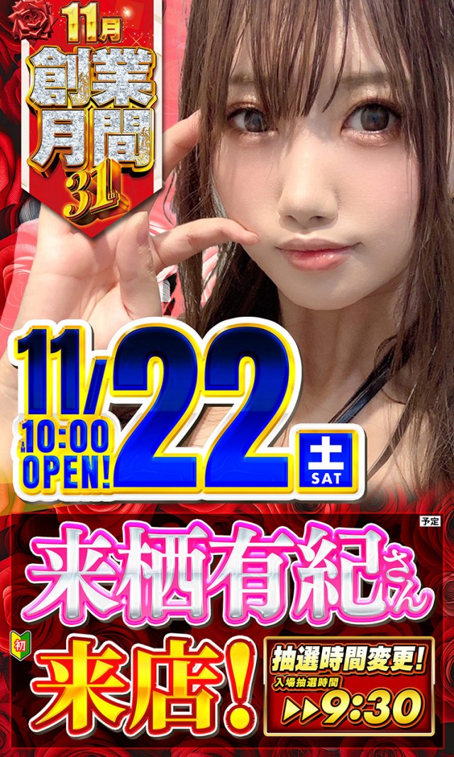 😊11月22日 (土) 来栖有紀さん来店!😄