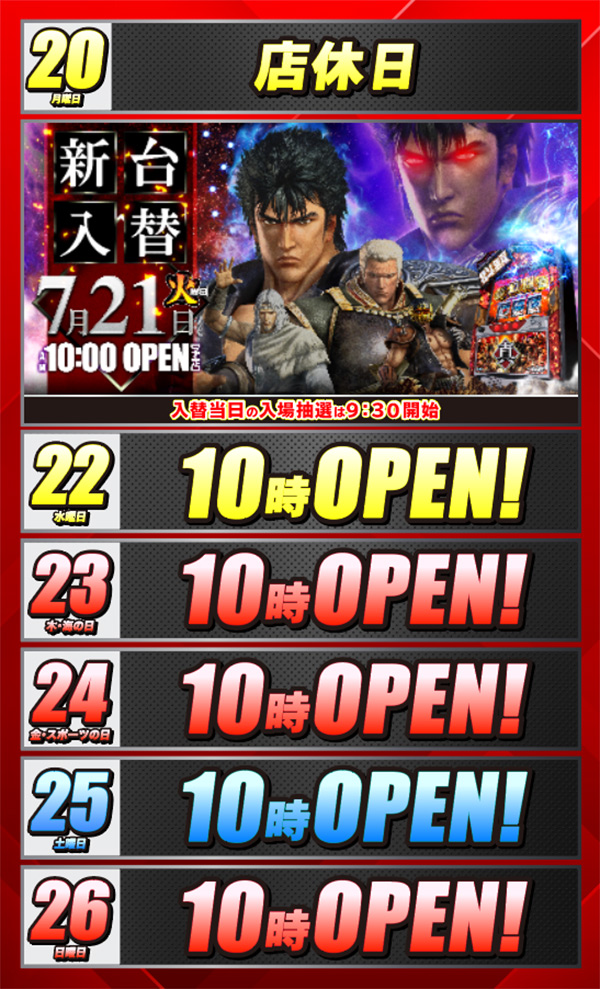 ■9:40抽選開始 ■新台入替当日など▶︎9:30抽選開始 |