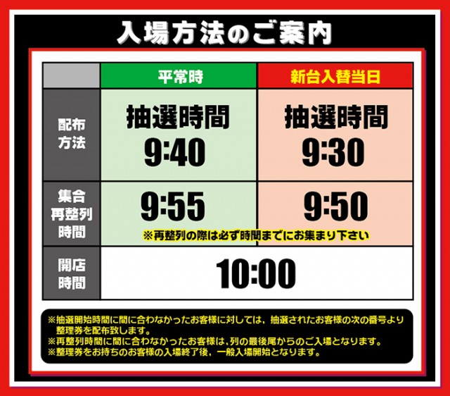 ■9:40抽選開始 ■新台入替当日など▶︎9:30抽選開始 |
