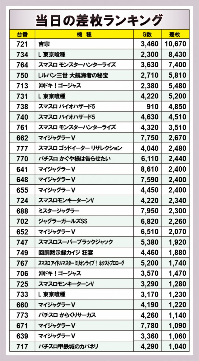 新台『吉宗』にて万枚OVERの熱気を放ち、さらに『L 東京喰種』が8,000枚OVER、『スマスロ モンスターハンターライズ』で7,000枚OVERと追随。その他にも『ジャグラー』シリーズなどのメダル機も多数ランクインしており、各所でまとまった出玉を確保していたのが印象的だ。打ちごたえのある状況に遊技していたファンは高揚感とともにレバーを叩いていたことだろう。