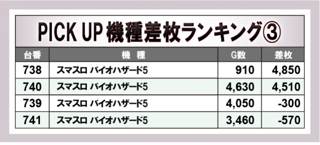 ランキング上位にランクインした『L 東京喰種』、『スマスロ モンスターハンターライズ』は他にもまとまった出玉を獲得する台が見られ、『スマスロ バイオハザード5』も同様に気を吐いていた。また『マイジャグラーⅤ』も高い活気を披露しており、回転数と差枚数が比例する展開を披露していたのも見逃せない。これら優秀機種が存在感を放っていたことで店内は盛り上がりに包まれ、遊技するファンを笑顔にしたと言って間違いなさそうだ。