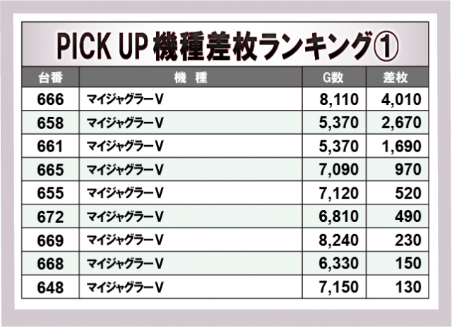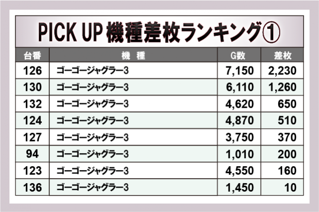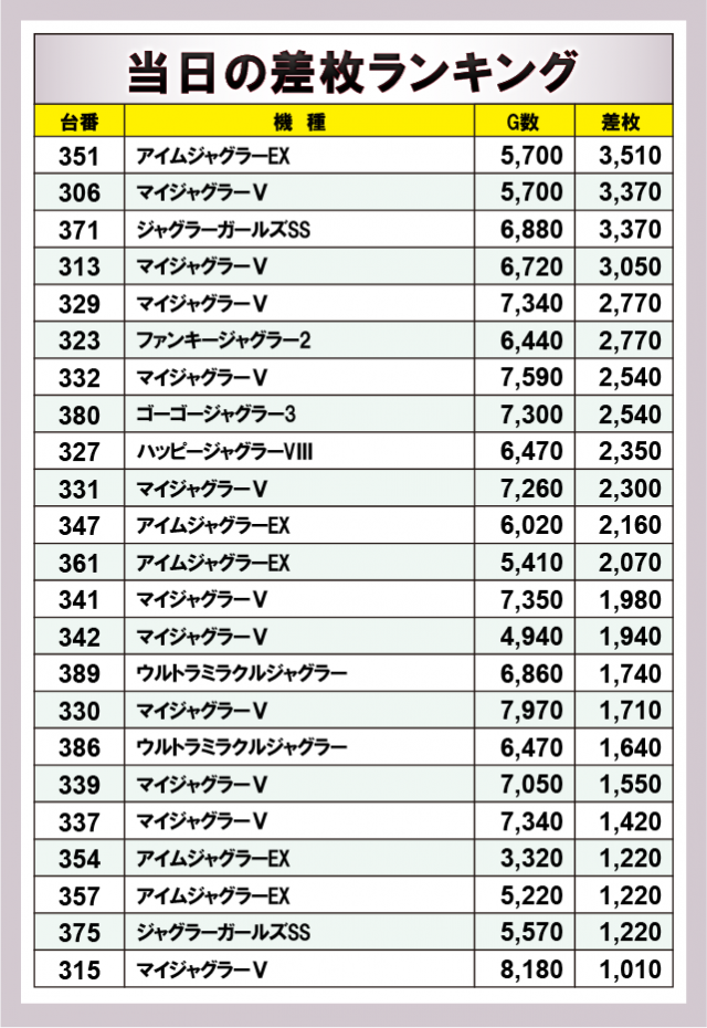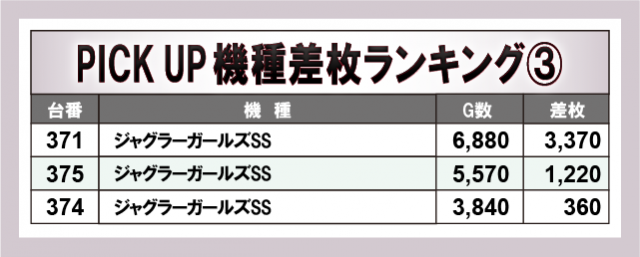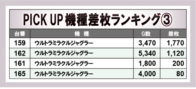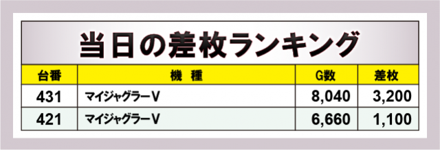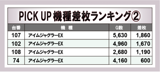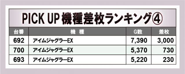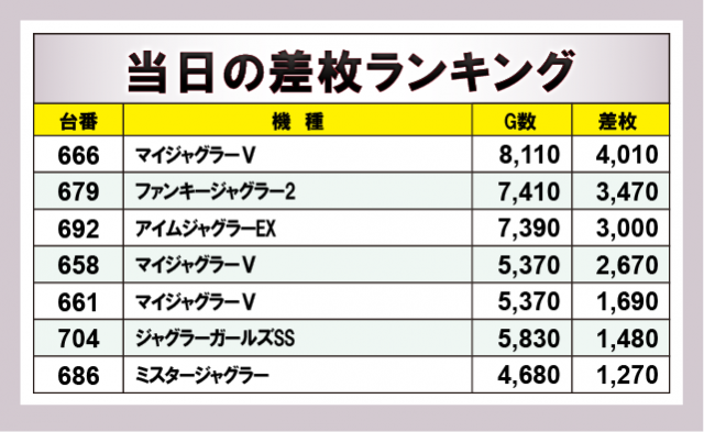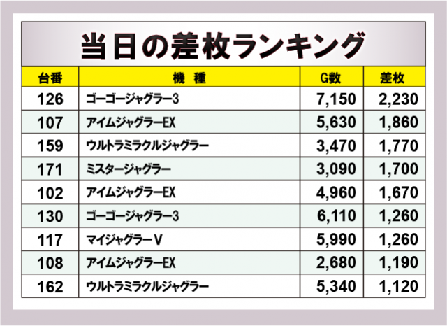「玉屋409雑餉隈」では『ゴーゴージャグラー3』から+2,000枚OVERが発生し、『アイムジャグラーEX』『ウルトラミラクルジャグラー』からも4桁プラス台を確認できることから、チャンスは各所にあったようだ!