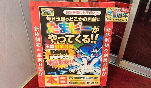 8月27日、『玉屋中尾店』にて玉屋×DMMぱちタウンのコラボ企画「たまピー来店取材」が実施された。今回が3度目の実施となったわけだが、過去2回ではしっかり結果を残しているだけに、この日朝から駆けつけたファンは大きな期待感を抱いていたのが印象に残る。対して同店はどっしりと構えていた様子が窺え、多くのファンを迎え入れる準備は万全という姿を見せていたのが鮮烈だ。果たしてどのような1日になったのか…さっそく詳細データとともに、店内の様子をお伝えしていくぞ!