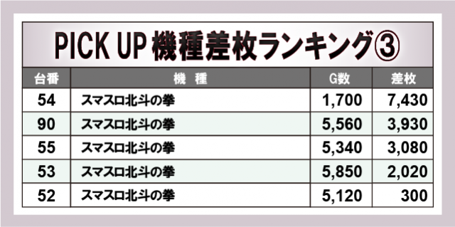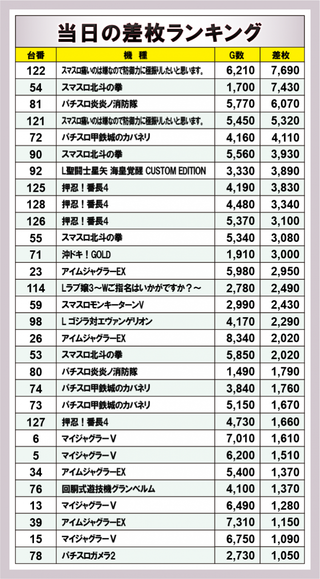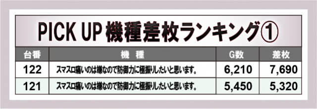 上表の通り、『スマスロ痛いのは嫌なので防御力に極振りしたいと思います。』『スマスロ北斗の拳』で+7,000枚OVERが発生。さらに『パチスロ炎炎ノ消防隊』で+6,000枚OVERと気を吐き、この他にも4桁プラス台が多く生まれていたことから、あらゆる機種にチャンスがあったと言えだるろう。