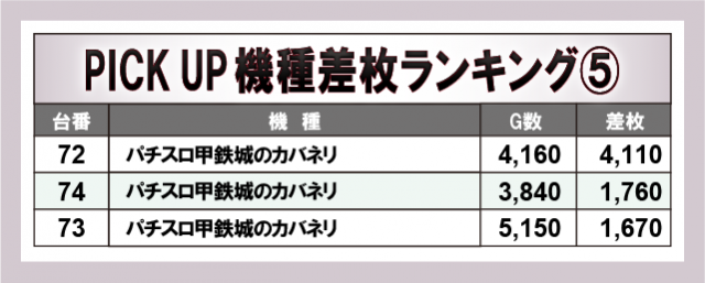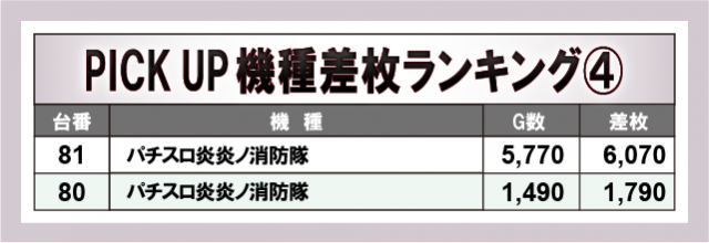 優秀機種として取り上げた5機種は、いずれも高いポテンシャルを発揮し、高い活気を披露していたのが上表から窺える。『スマスロ痛いのは嫌なので防御力に極振りしたいと思います。』『押忍!番長4』『パチスロ炎炎ノ消防隊』『パチスロ甲鉄城のカバネリ』では、全台プラス差枚を記録し、大きな熱気を放っていたのが目に焼き付く。