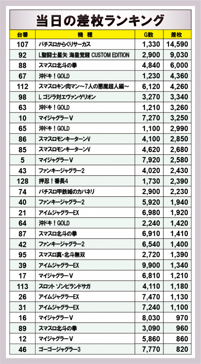 前回と同じ『パチスロからくりサーカス』から万枚OVERが発生!さらに『L聖闘士星矢 海皇覚醒 CUSTOM EDITION』で+9,000枚OVER、『スマスロ北斗の拳』で+6,000枚OVERをマークするなど、スマスロ機の圧倒的威力をみせつけた。また、『ジャグラー』シリーズも奮闘しており、人気機種たちがしっかりと活躍していた様子が窺えたことから、ファンは至福のひと時を過ごしていたことだろう。