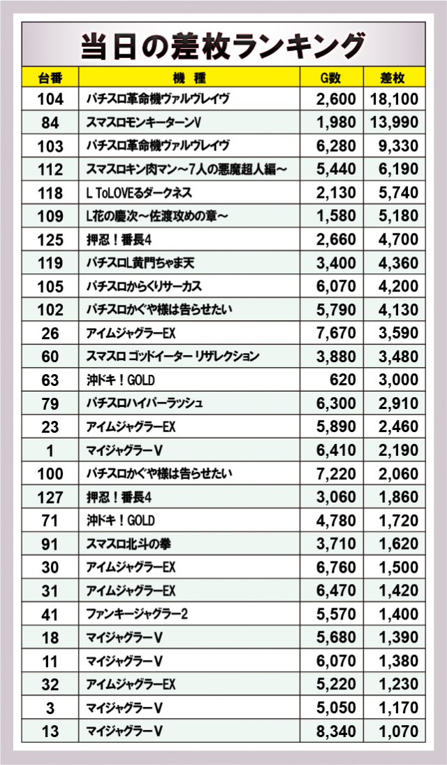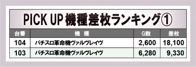上表に取り上げた4機種は、いずれも高い活気と熱気を披露していたのが特徴的だ。万枚OVERが発生したことはもちろん、全台プラス差枚を達成する機種もみられ、右肩上がりに伸びていくグラフを描いていた事実に好感を覚えずにはいられない。名機『パチスロ 革命機ヴァルヴレイヴ』はもちろん、『アイムジャグラーEX』もコンスタントに大当りを重ね、ハイスペック機種からノーマル機種まで様々な機種でチャンスがあったことで遊技するファンは笑顔をこぼしていたに違いない。