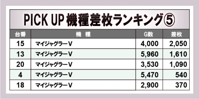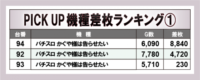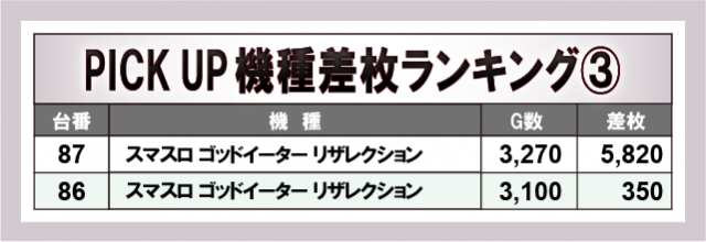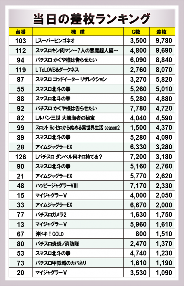 当日とくに店内を盛り上げた機種は上表の5機種。『パチスロ かぐや様は告らせたい』『スマスロ ゴッドイーター リザレクション』で全台プラス差枚をマークするほか、不動の人気機種『スマスロ北斗の拳』も設置台数の半数以上がプラス差枚を記録した。また、『アイムジャグラーEX』『マイジャグラーⅤ』でも4桁プラス台が複数台発生する好調さを披露し、十分な手応えを感じたファンも多かったに違いない。