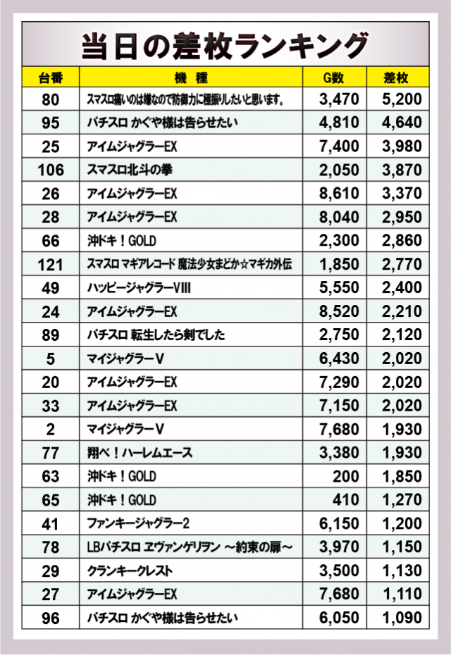速報時でも取り上げた『アイムジャグラーEX』は、その後も高い回転数も記録しており、ほとんどの台で終日を通して打ち込まれたことが確認できる。そのなかで24番台から28番台の5台は4桁プラス台を輩出しており、遊技するファンが競い合うかのようにレバーを叩いていたのが印象的だ。