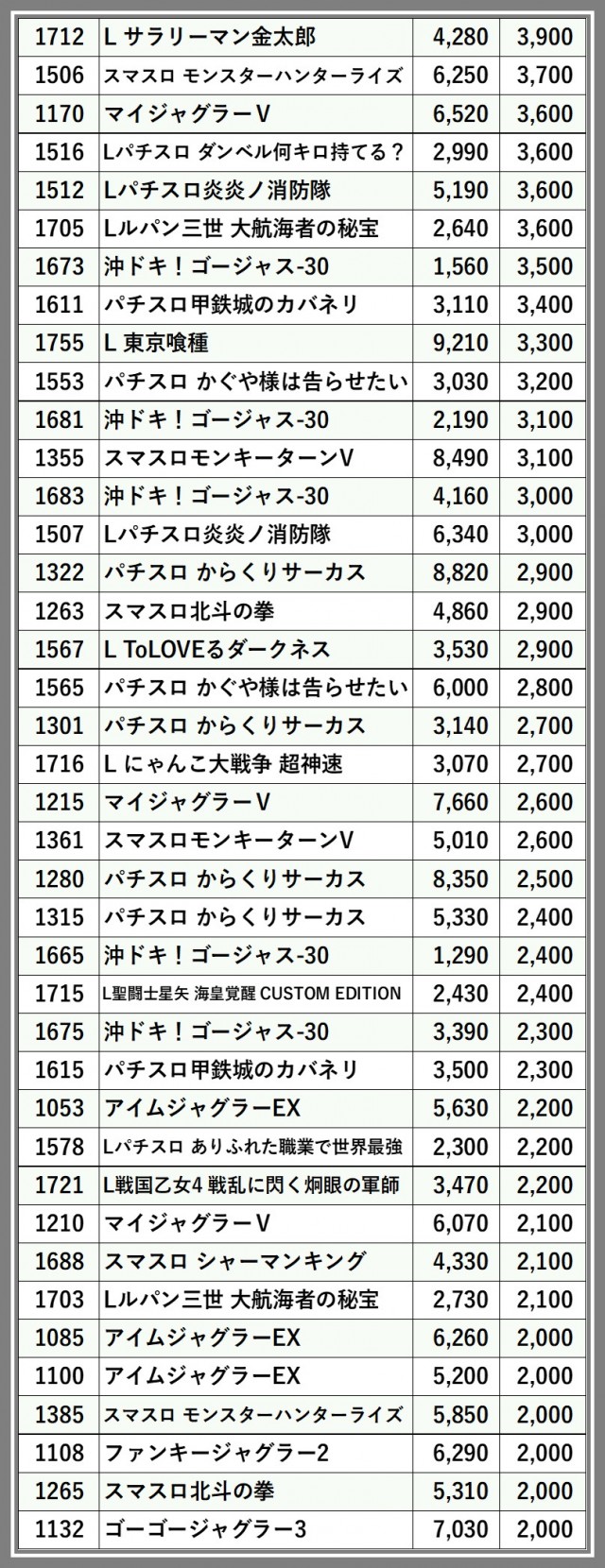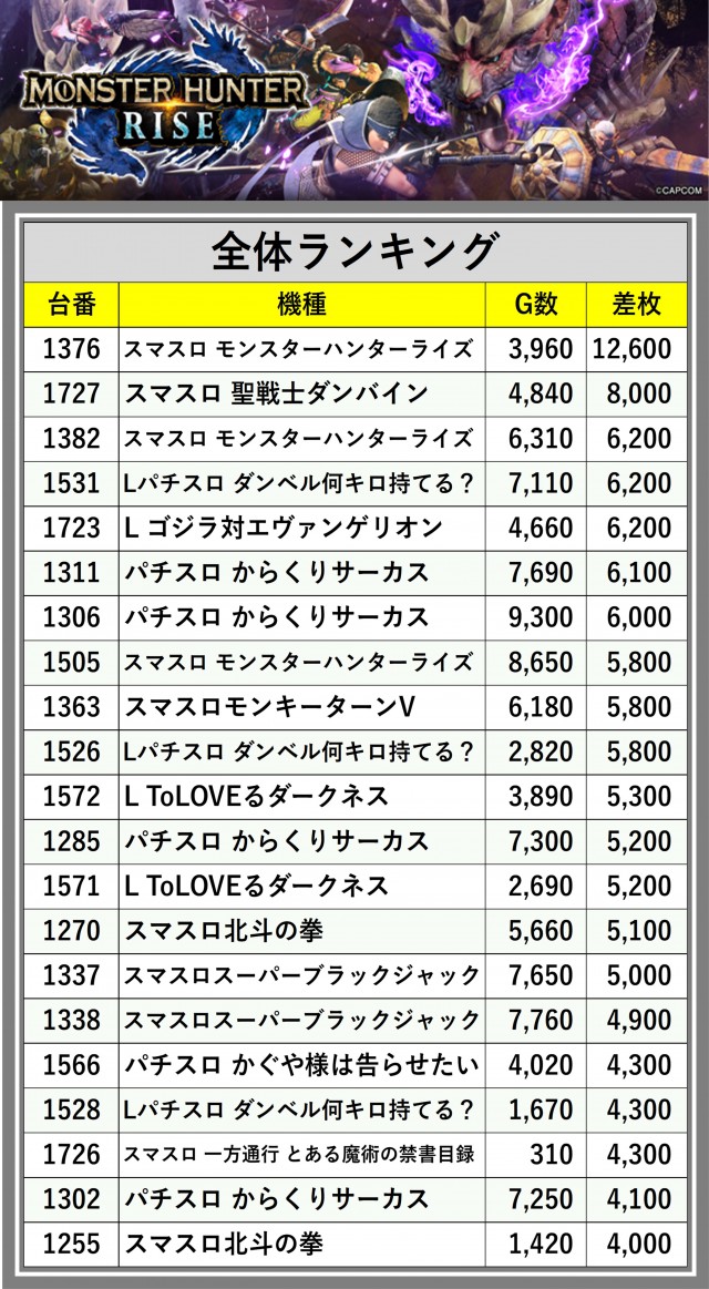 厳選された取材対象機種をはじめ、その他スロット全体から好記録が飛び出した!プレイヤーが楽しんだ1日を下記データにて振り返ってみて欲しい。
