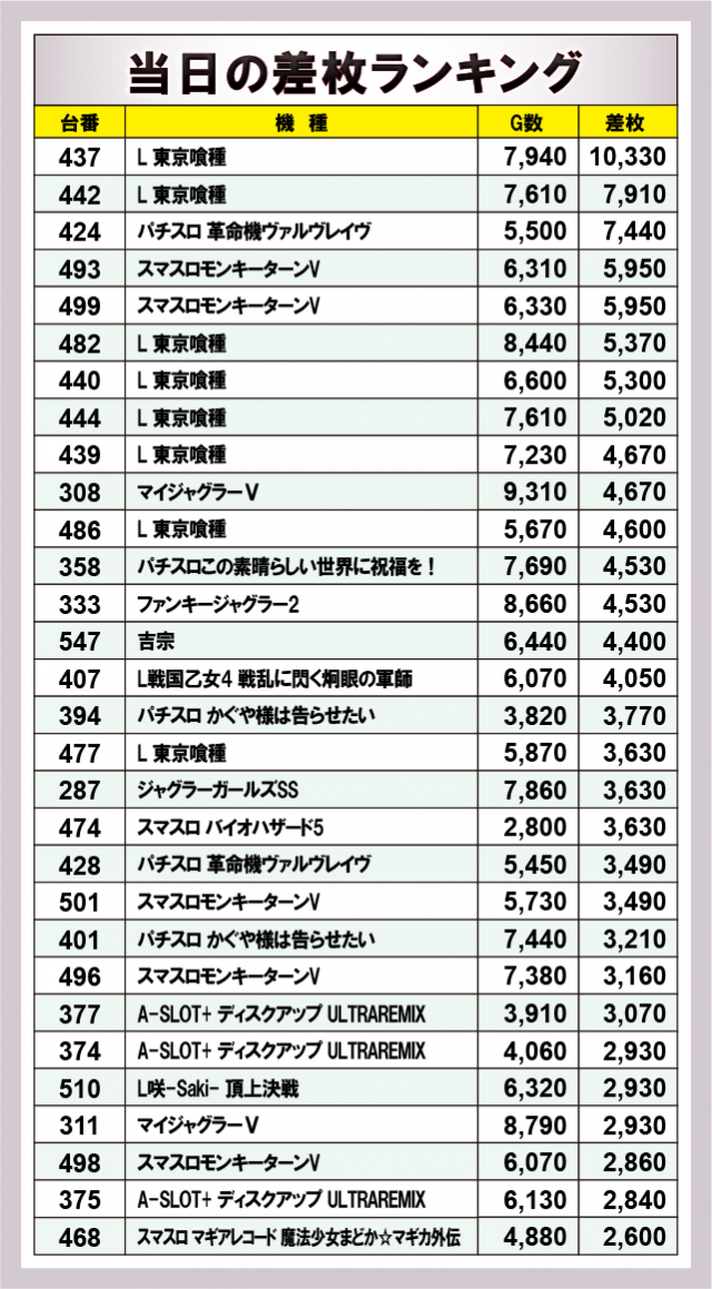 『L 東京喰種』にて万枚OVERが飛び出し、さらにその下にも複数台ランクインする盛況ぶりを披露していた!ほかにもスマスロ機を中心に随所で見どころのある展開が繰り広げられていたが、同時に『ジャグラー』シリーズや『パチスロこの素晴らしい世界に祝福を!』といったメダル機も名を連ね、その存在感をアピールしていたのが鮮烈だ。