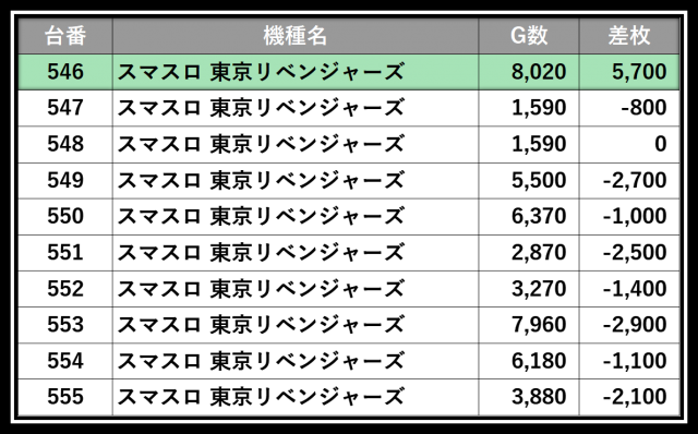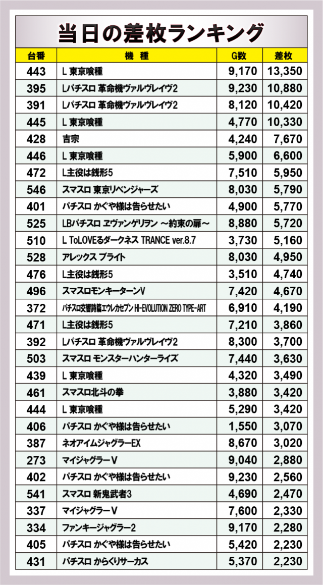 この日、ランキングを制したのは『L 東京喰種』。9,170Gの高稼働から+13,350枚という圧巻の内容で、さらに同機種の別台も+10,330枚をマークしており、この日の主役にふさわしい結果を残した。続いて『Lパチスロ 革命機ヴァルヴレイヴ2』が+10,880枚、こちらもまた同機種の別台が+10,420枚と、機種単位でのまとまりも確認できる。ほかにも『吉宗』や『L主役は銭形5』、『スマスロ 東京リベンジャーズ』などスマスロ定番機種たちがしっかりと上位に食い込み、各コーナーで勢いのある光景が広がっていた!