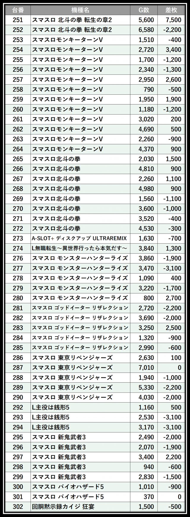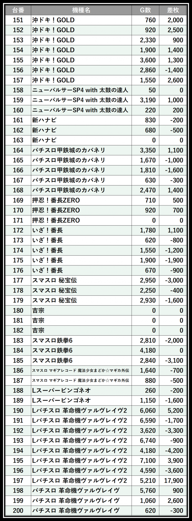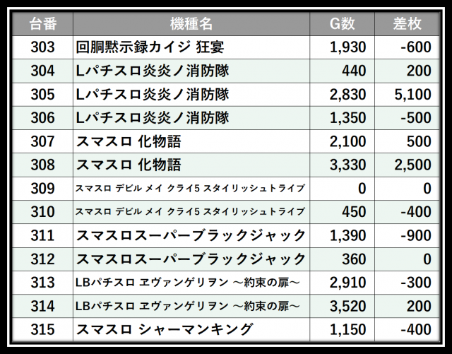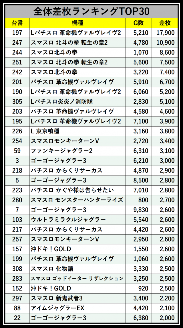 ※差枚数順に掲載しています