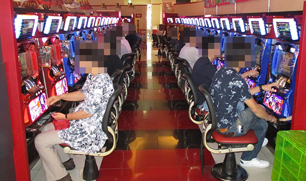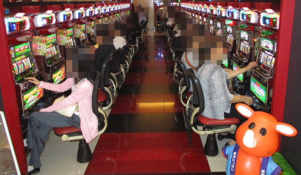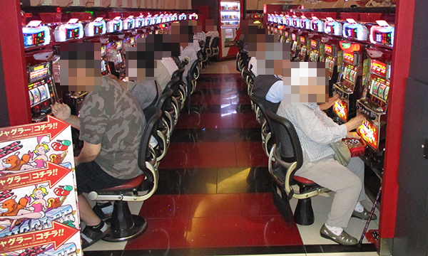 20円パチスロをみてみると、ジャグラーシリーズが大盛況。遊技をおこなうプレイヤーたちの表情は明るく、シマ中に楽しい雰囲気が広がっていた。