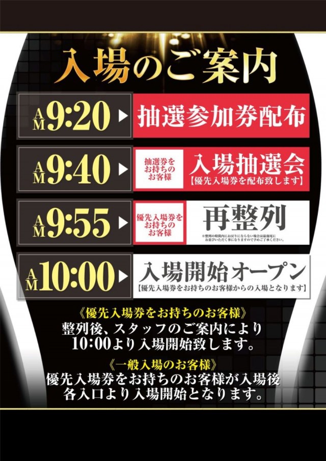 9:20~9:40⇒抽選参加券配布 9:40⇒抽選開始 9:55⇒整列 10:00⇒優先入場券お持ちの方から入場となります |