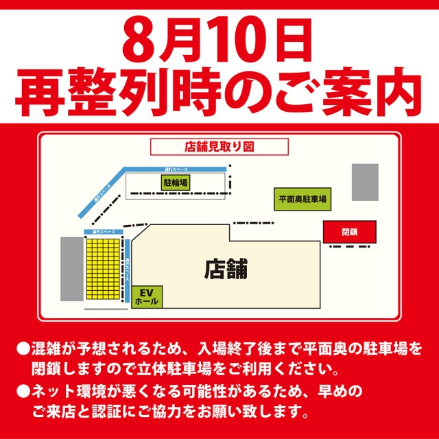 通常朝10時開店の際は、再整列時間は【9:50~】です。*抽選・再整列時間変更の際は、店内ポスターやHP等でお知らせ致します。 |