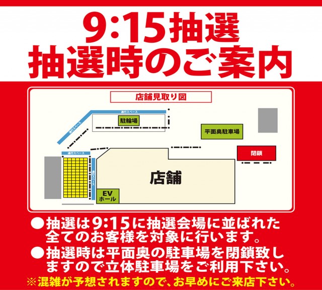 通常朝10時開店の際は、再整列時間は【9:50~】です。*抽選・再整列時間変更の際は、店内ポスターやHP等でお知らせ致します。 |
