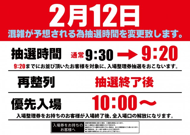 通常朝10時開店の際は、再整列時間は【9:50~】です。*抽選・再整列時間変更の際は、店内ポスターやHP等でお知らせ致します。 |
