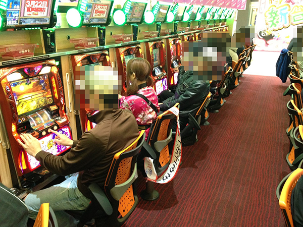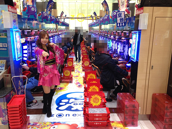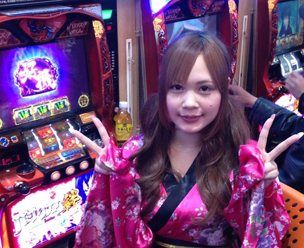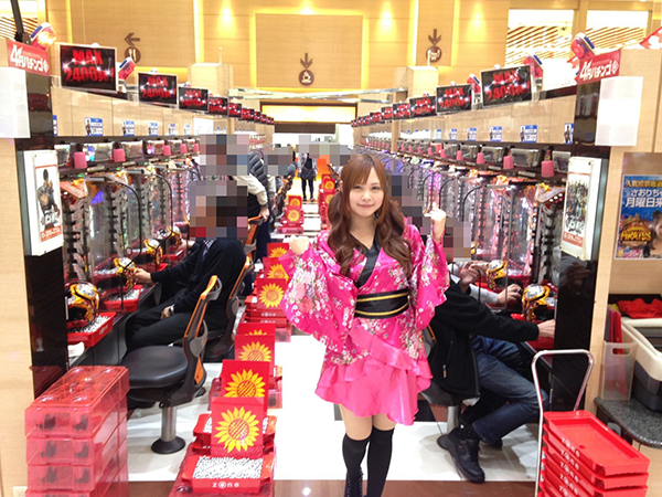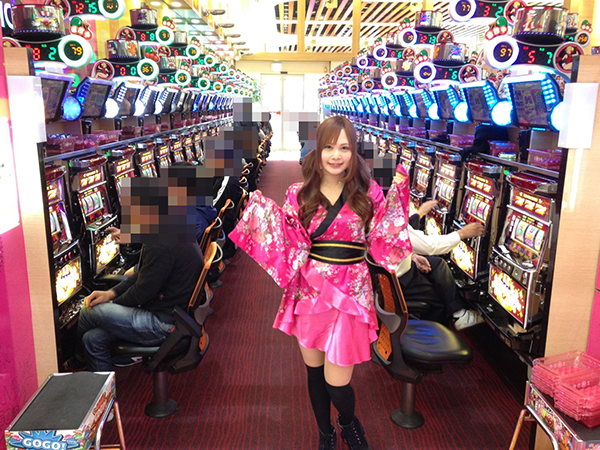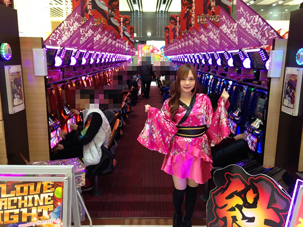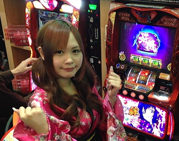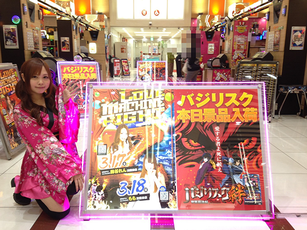 早くもにぎわいをみせるパチスロコーナーからももちゃんが選んだのは「バジリスク~甲賀忍法帖~絆」。