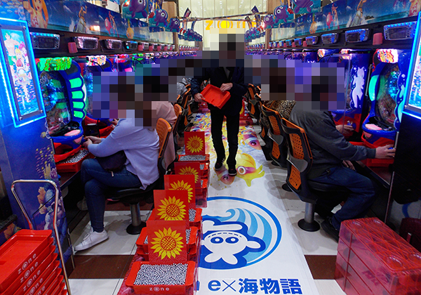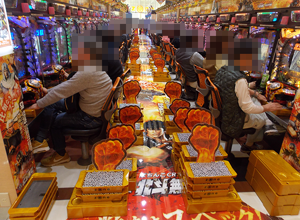 4円パチンコでは、海物語シリーズと「ぱちんこCR真・北斗無双」が盛況。いたるところにステキな光景が広がっており、にぎやかな状況となっていた。