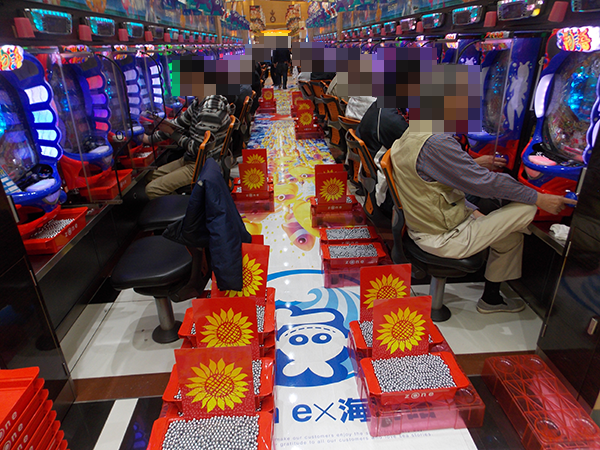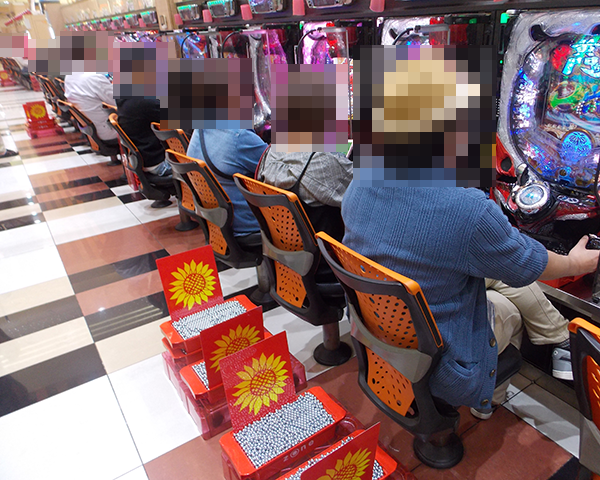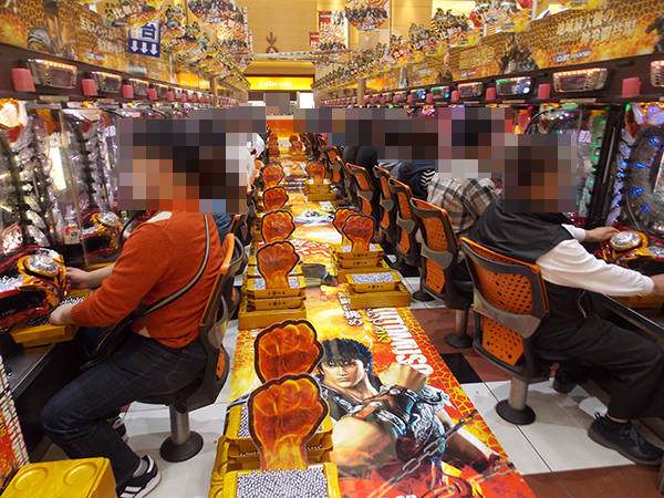 4円パチンコのなかで、とくに目立っていたのが海物語シリーズと「ぱちんこCR真・北斗無双」。機種の性能を引き出しているといったプレイヤーが多く、にぎやかな雰囲気も感じられた。