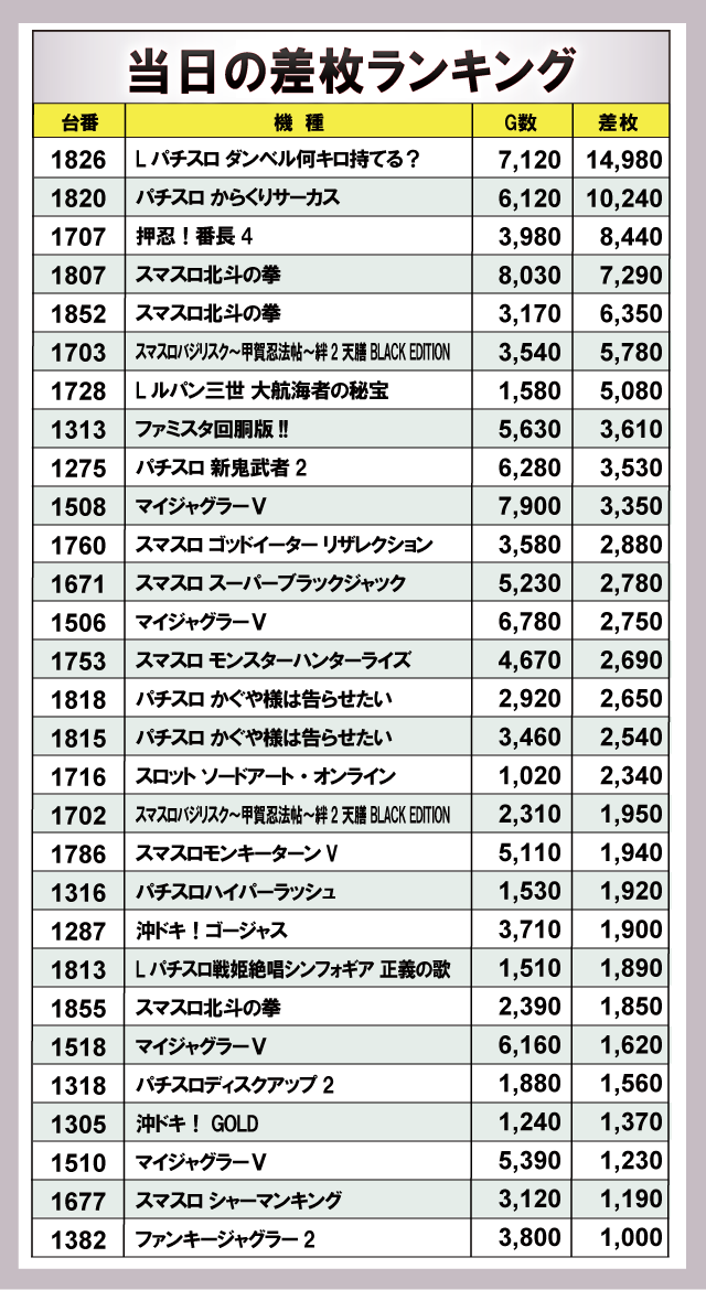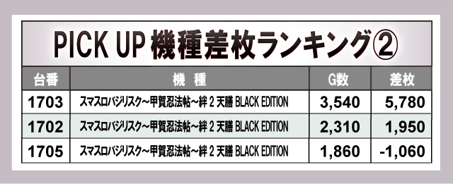 今回優秀機種として活躍したのが上表の5機種だ。『スマスロバジリスク~甲賀忍法帖~絆2 天膳 BLACK EDITION』は3台中2台がプラス終了と素晴らしい結果を残している。そのほかにも『パチスロハイパーラッシュ』は全台プラス差枚数を達成しており、優秀機種から盛り上がりが始まったと言えるだろう。