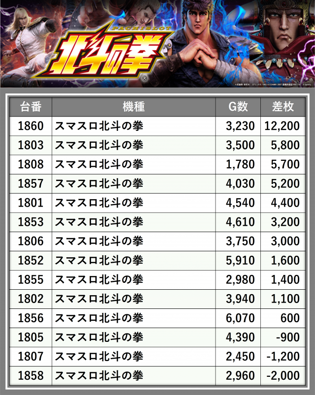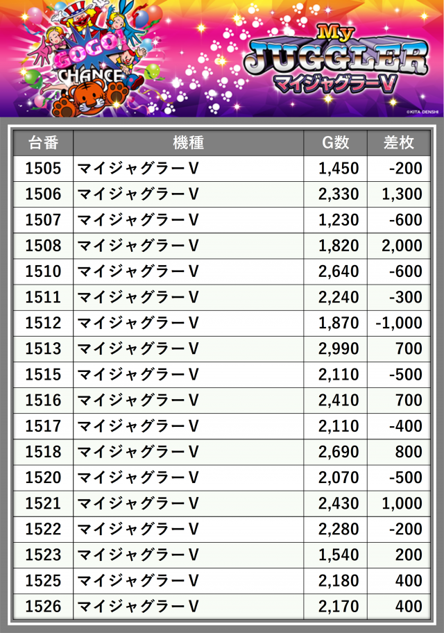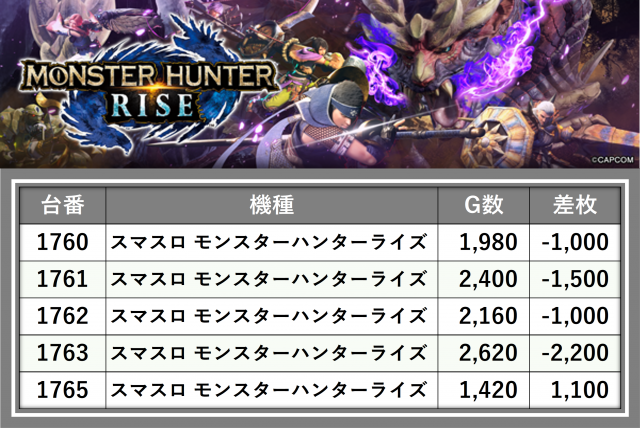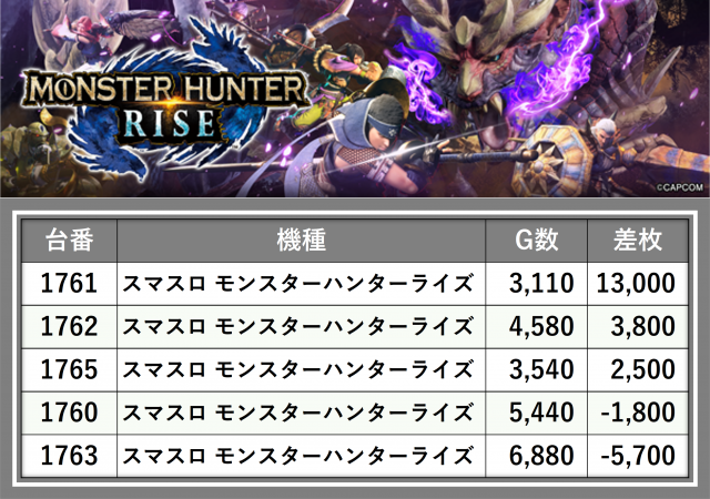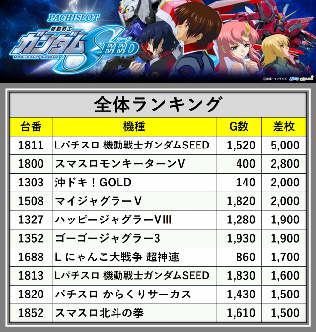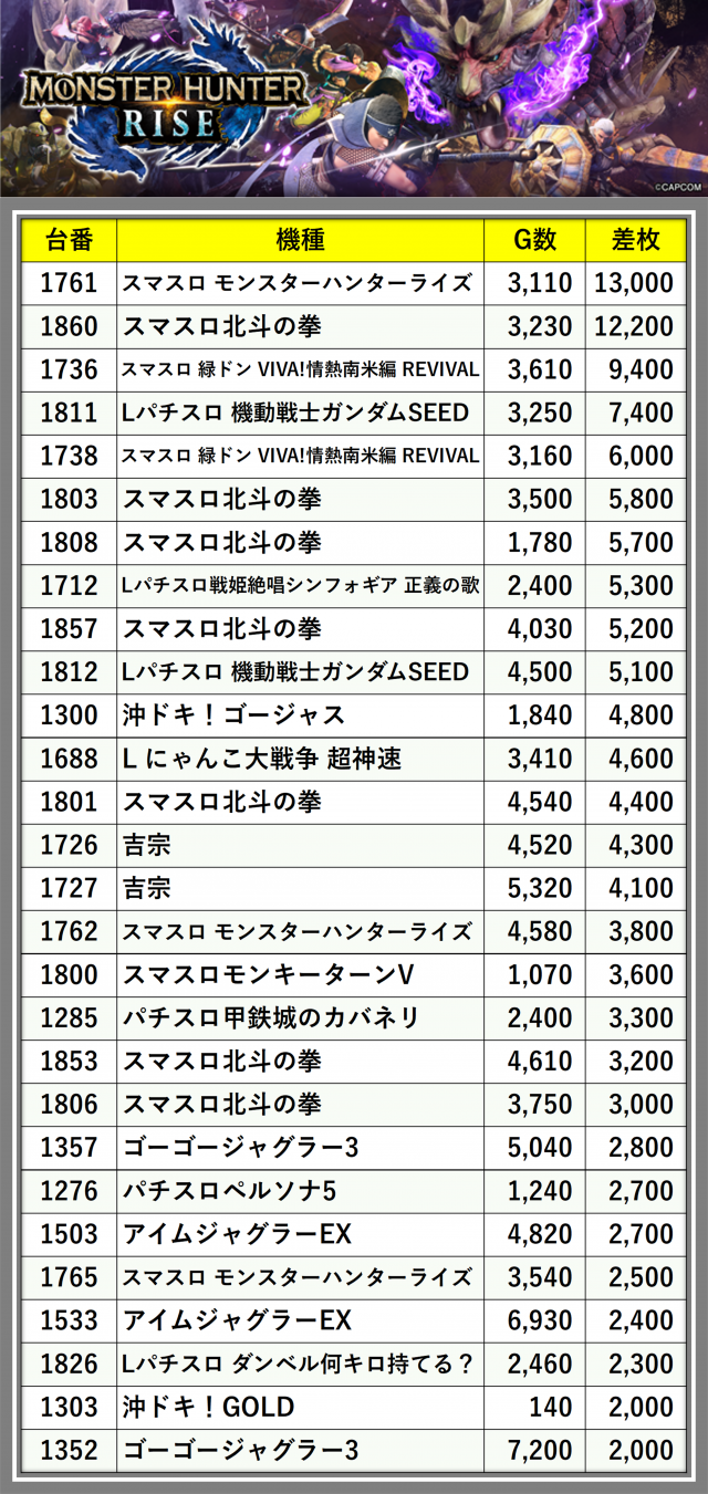厳選された取材対象機種をはじめ、その他スロット全体から好記録が飛び出した!プレイヤーが楽しんだ1日を下記データにて振り返ってみて欲しい。