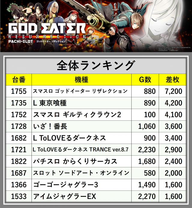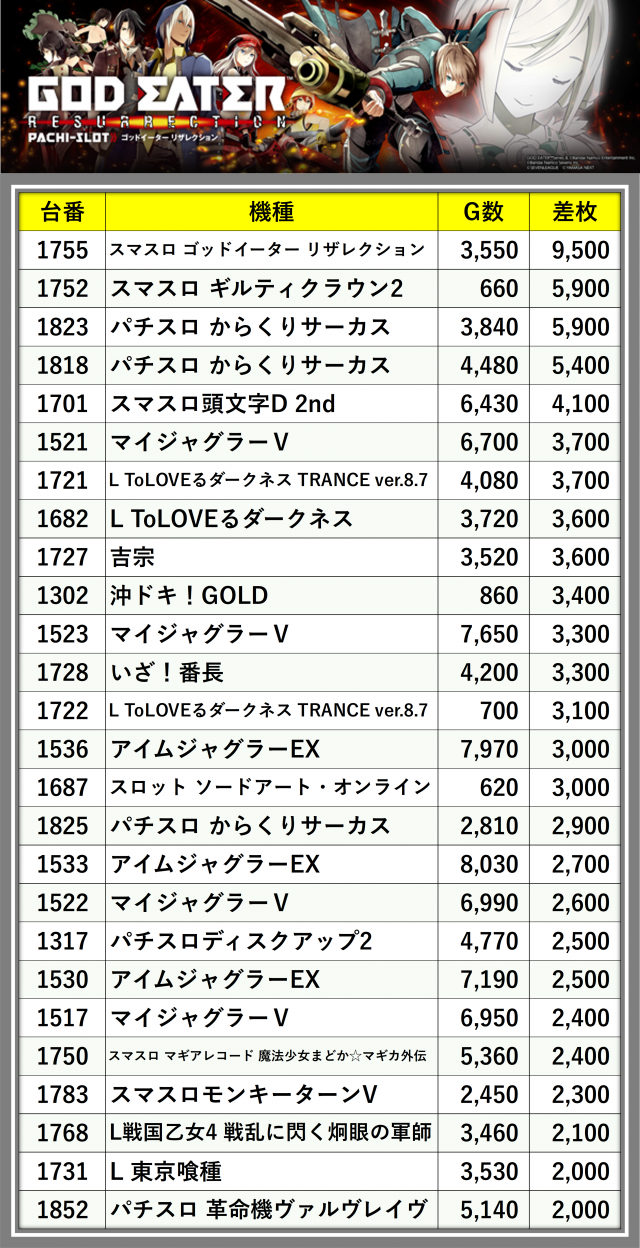 ※差枚数順に掲載しています