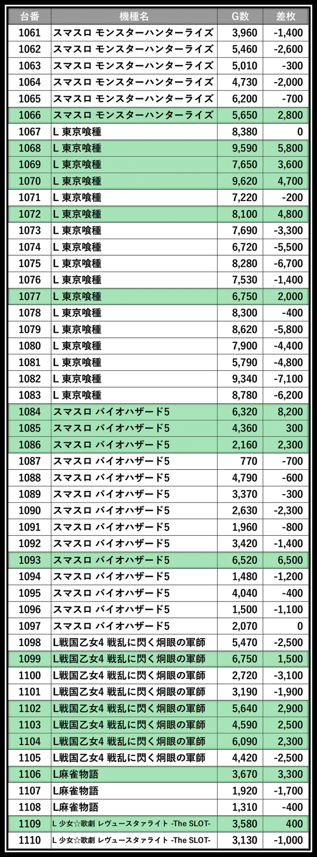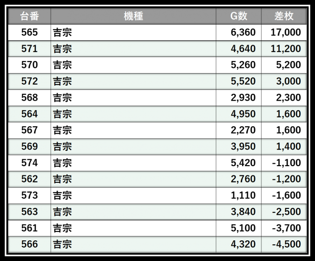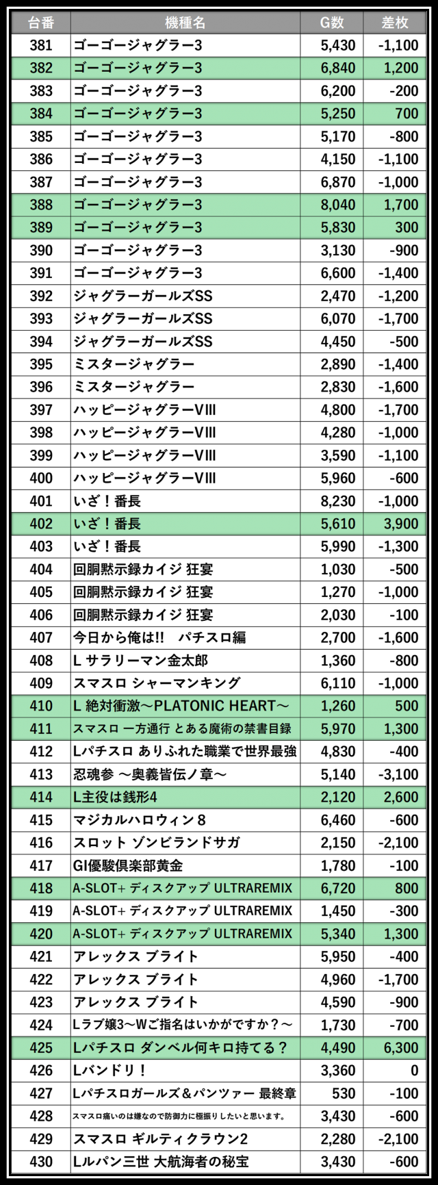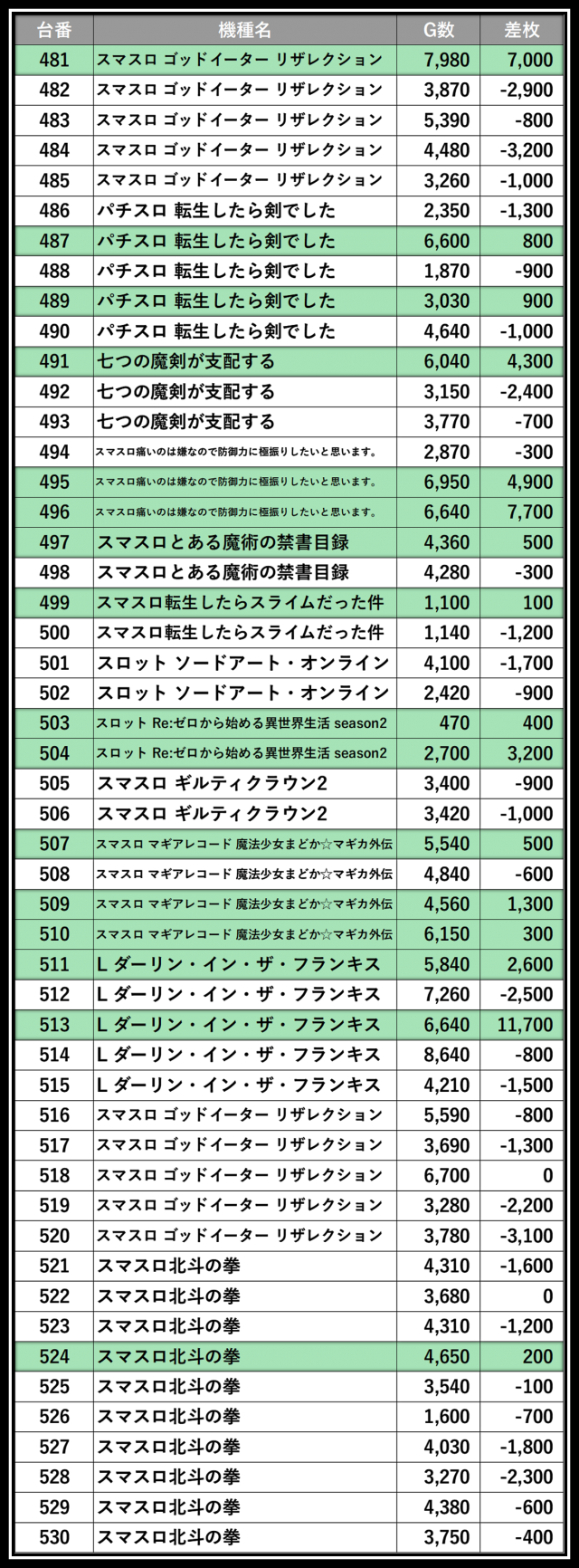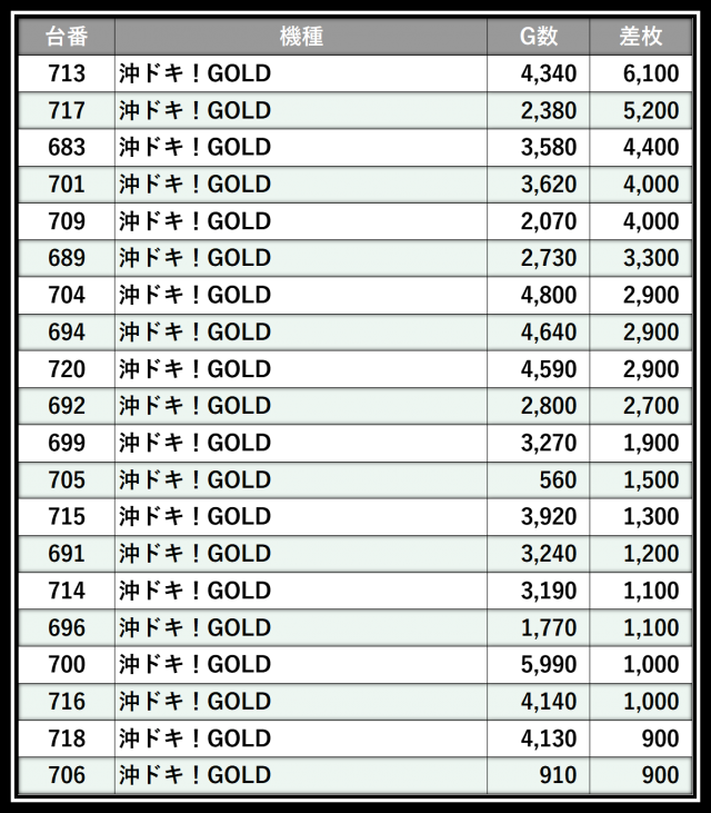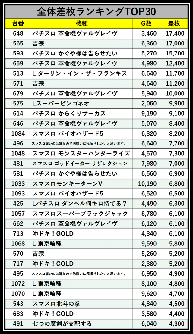 ※差枚数順に掲載しています