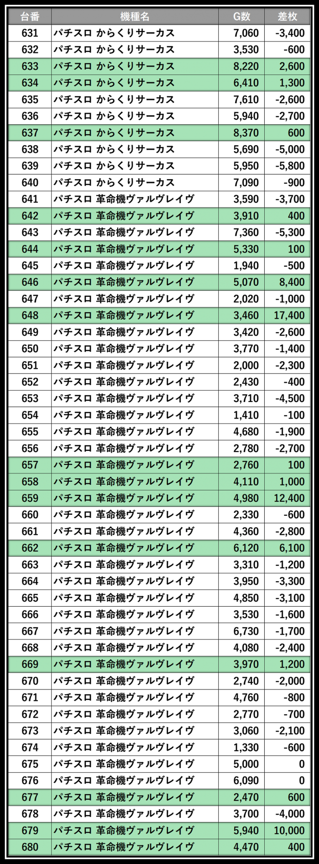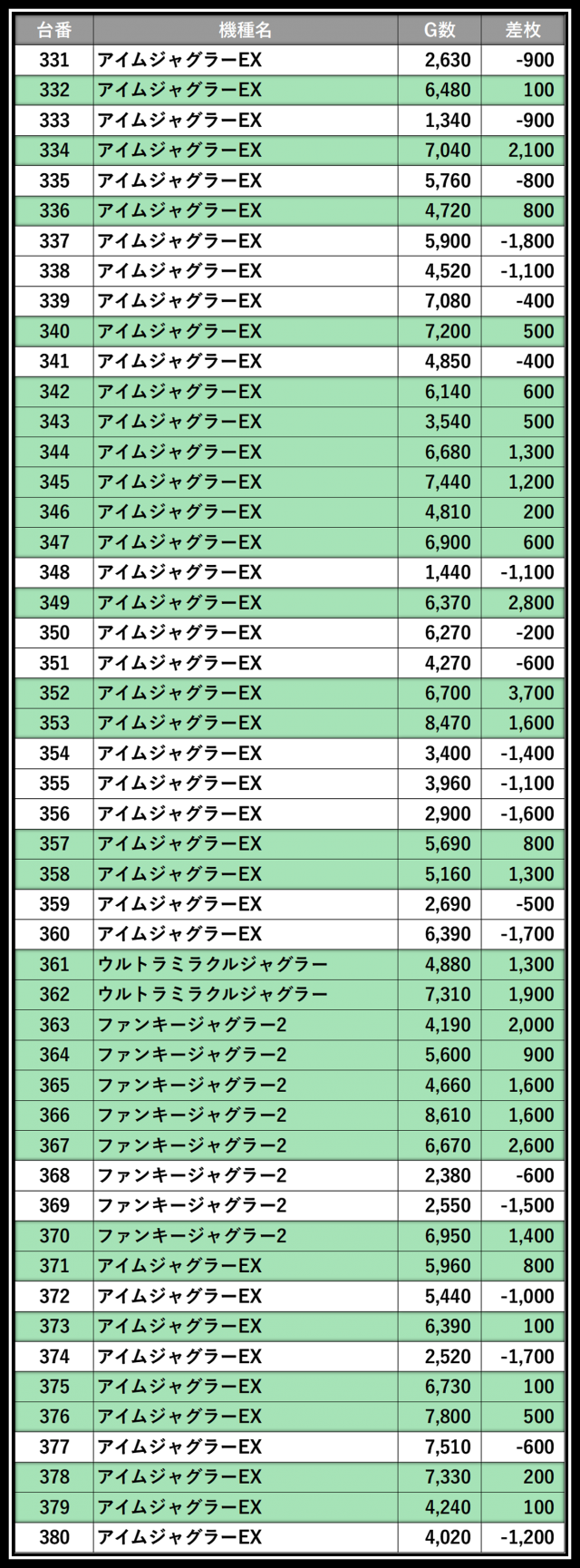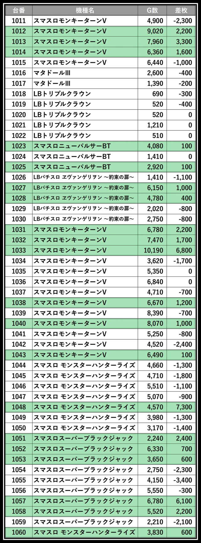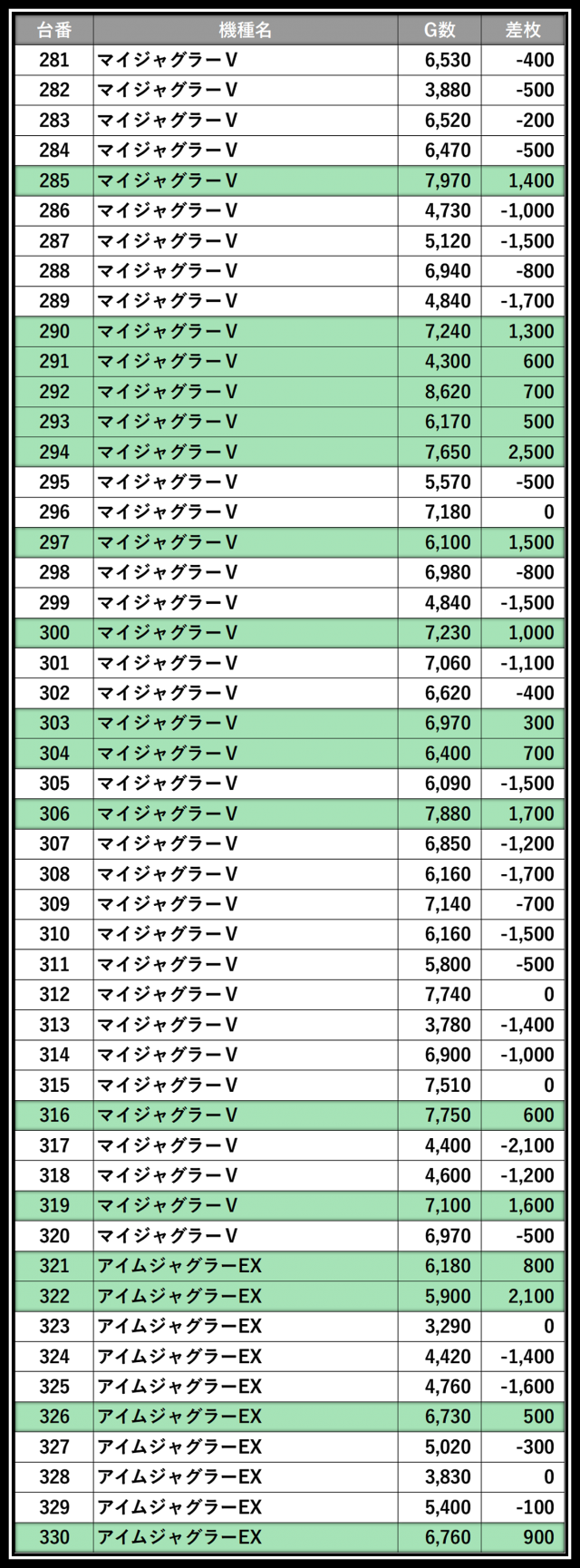 ※差枚数順に掲載しています