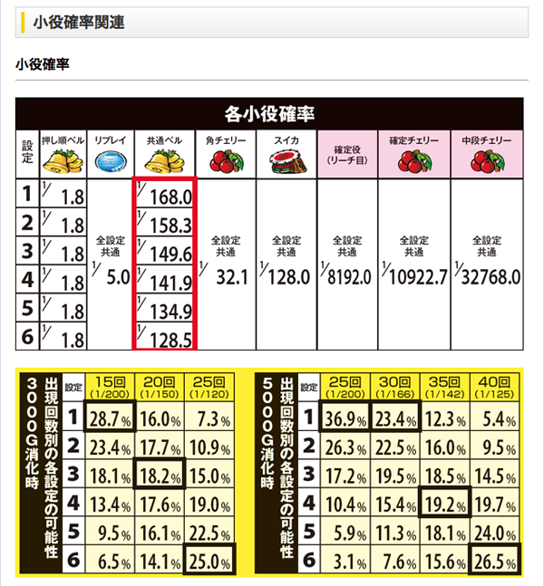 通常時からボーナス中まで、共通ベルをカウント。サンプルゲーム数が多く得られるだけに、設定推測のメインとして活用できるだろう。