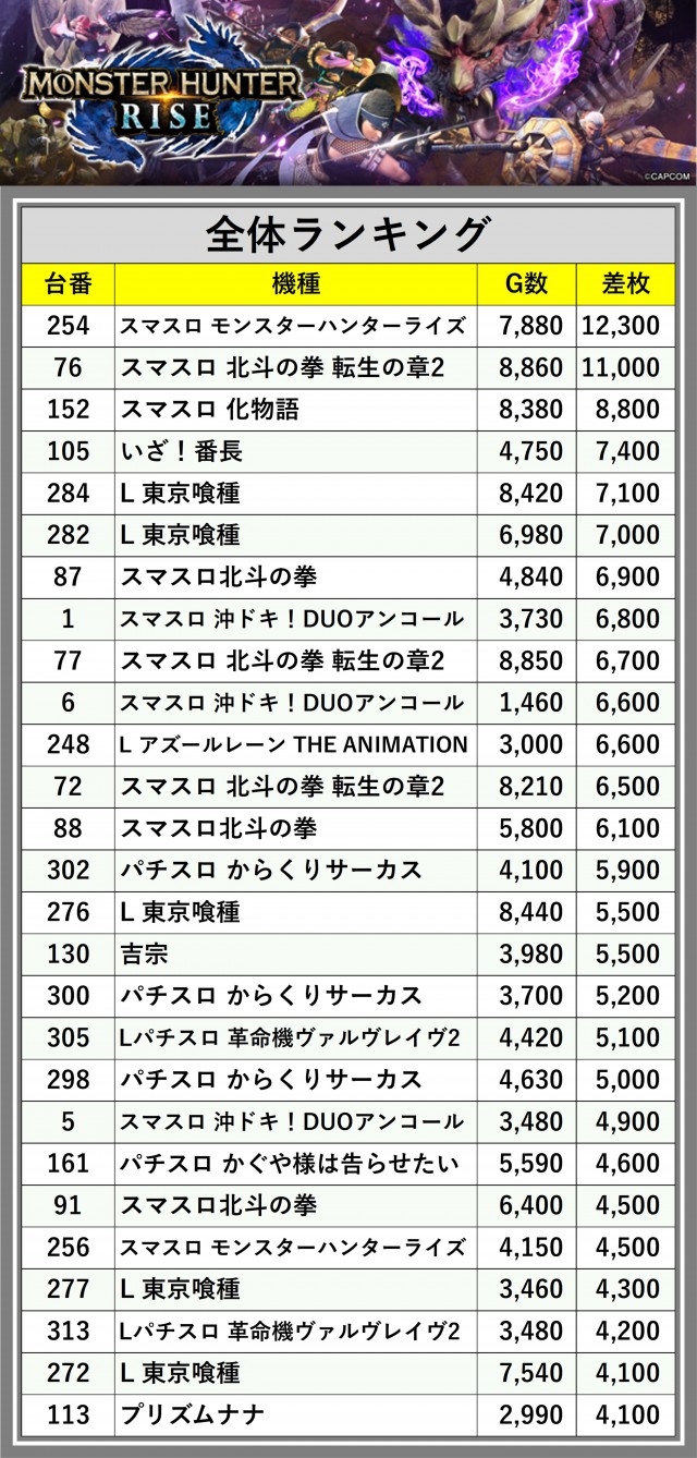 厳選された取材対象機種をはじめ、その他スロット全体から好記録が飛び出した!プレイヤーが楽しんだ1日を下記データにて振り返ってみて欲しい。
