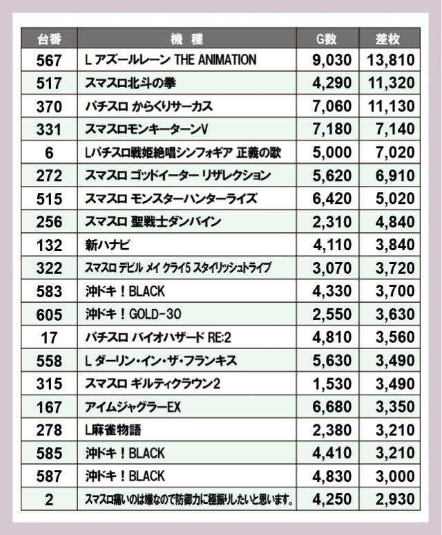 機種別差枚ランキング