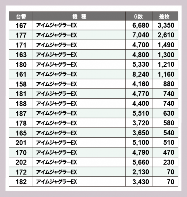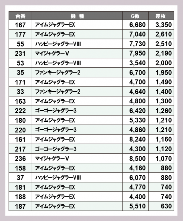 ジャグラー差枚ランキング