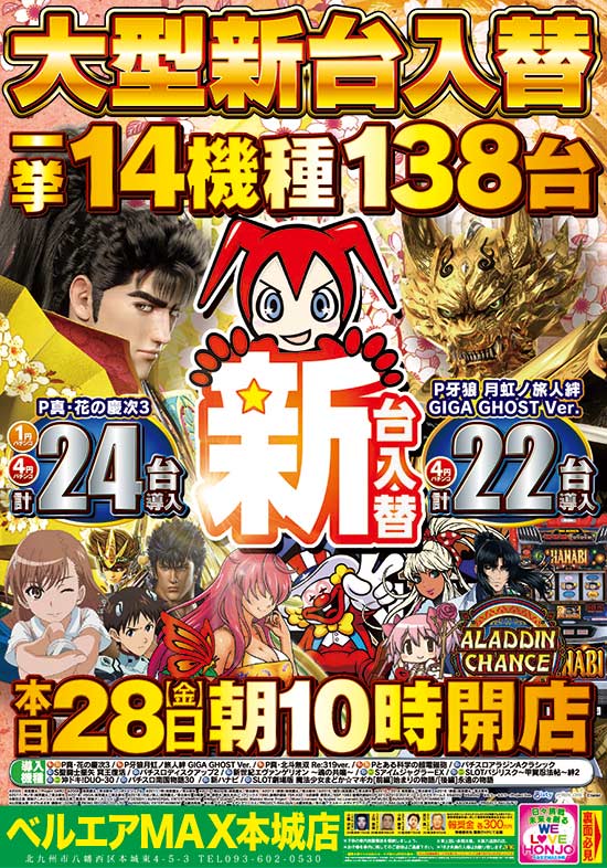 4円パチンコ264台 1円パチンコ176台 20円スロット325台 |