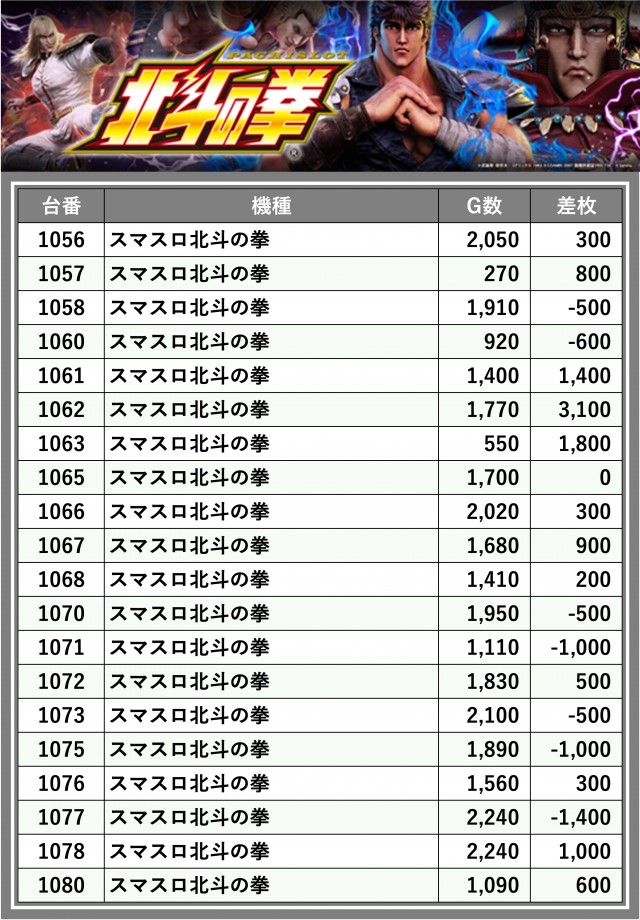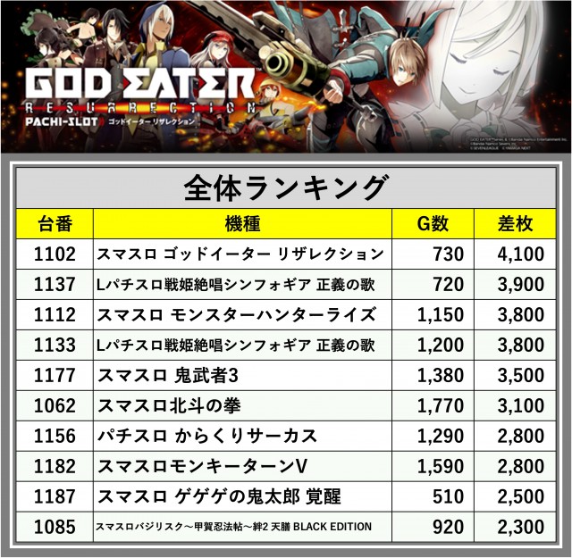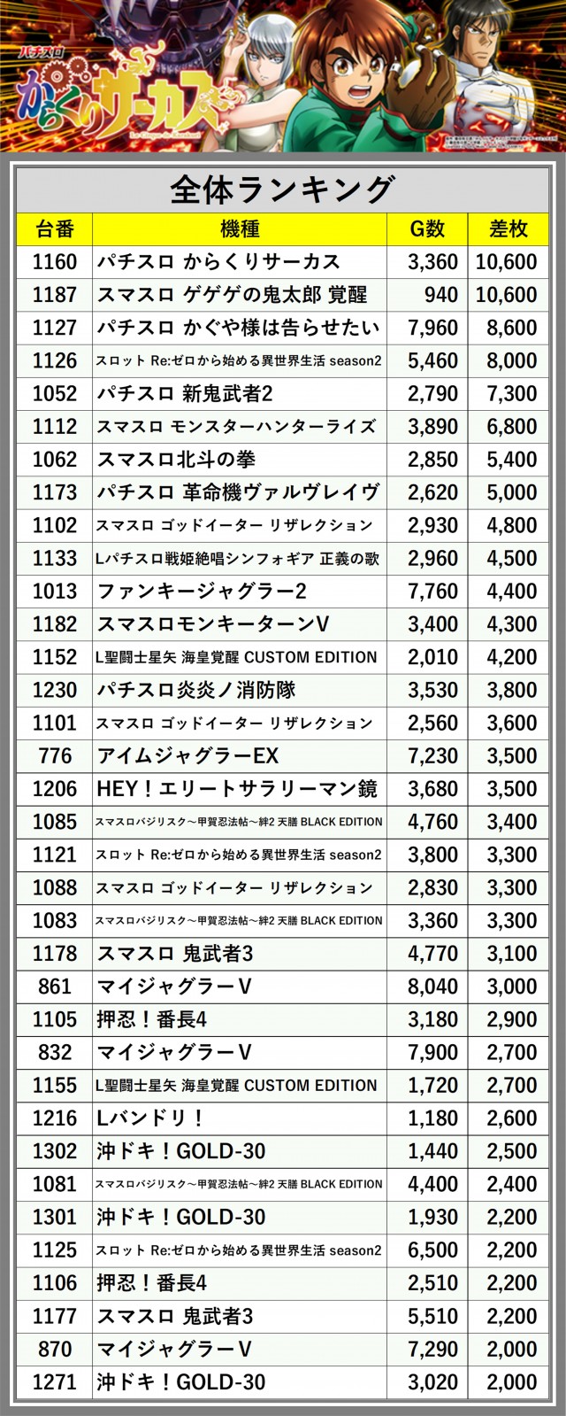 ※差枚数順に掲載しています