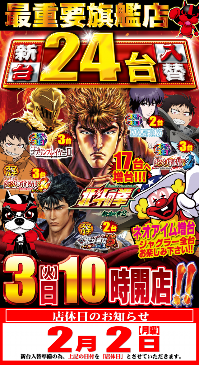 明日2/2(月)は新台入替準備の為、店休日とさせて頂きます。