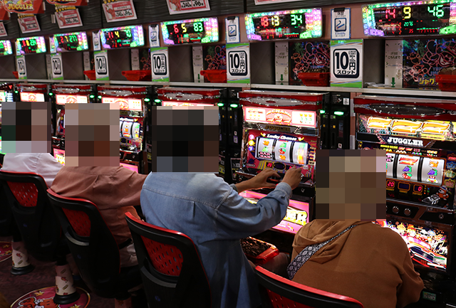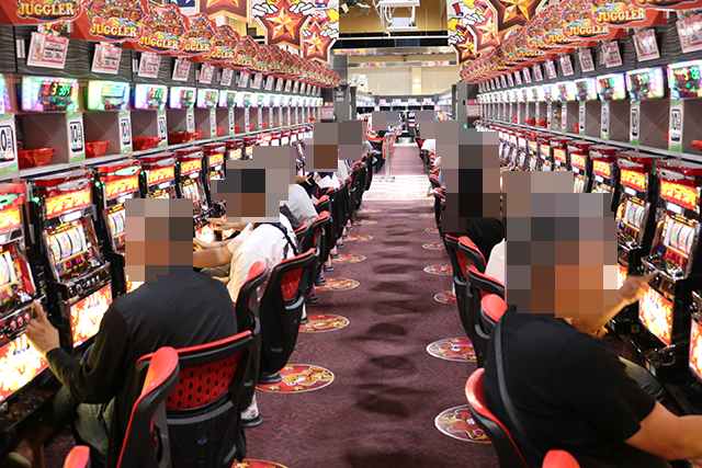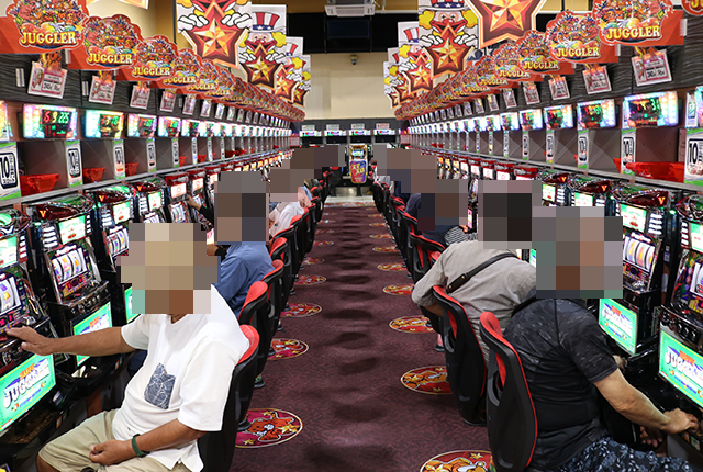 夕方頃のパチスロでは、「アイムジャグラーEX」がたくさんの笑顔に彩られていた。