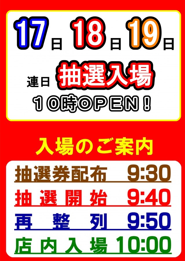 明日 18日 10時OPEN!抽選入場です