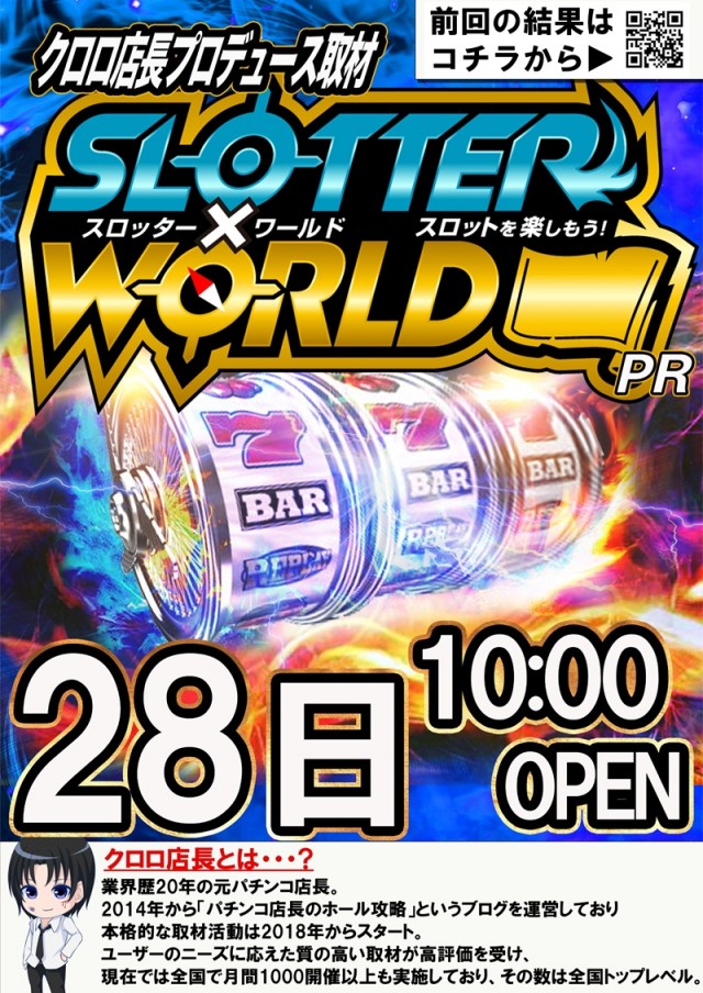 本日 28日 クロロ店長スロッターワールド 10時OPEN!